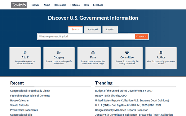 - Deep Search — Perform complex searches across the entire GovInfo database to find relevant legislative or regulatory documents