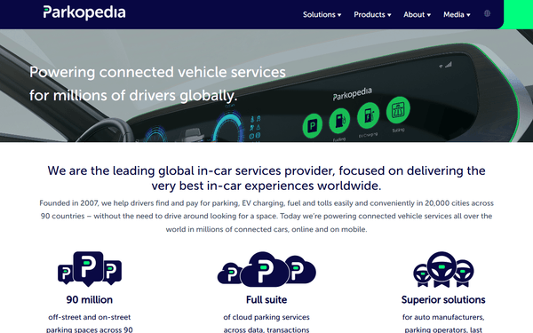 Global parking search, EV charging, and restrictions data via Parkopedia API.